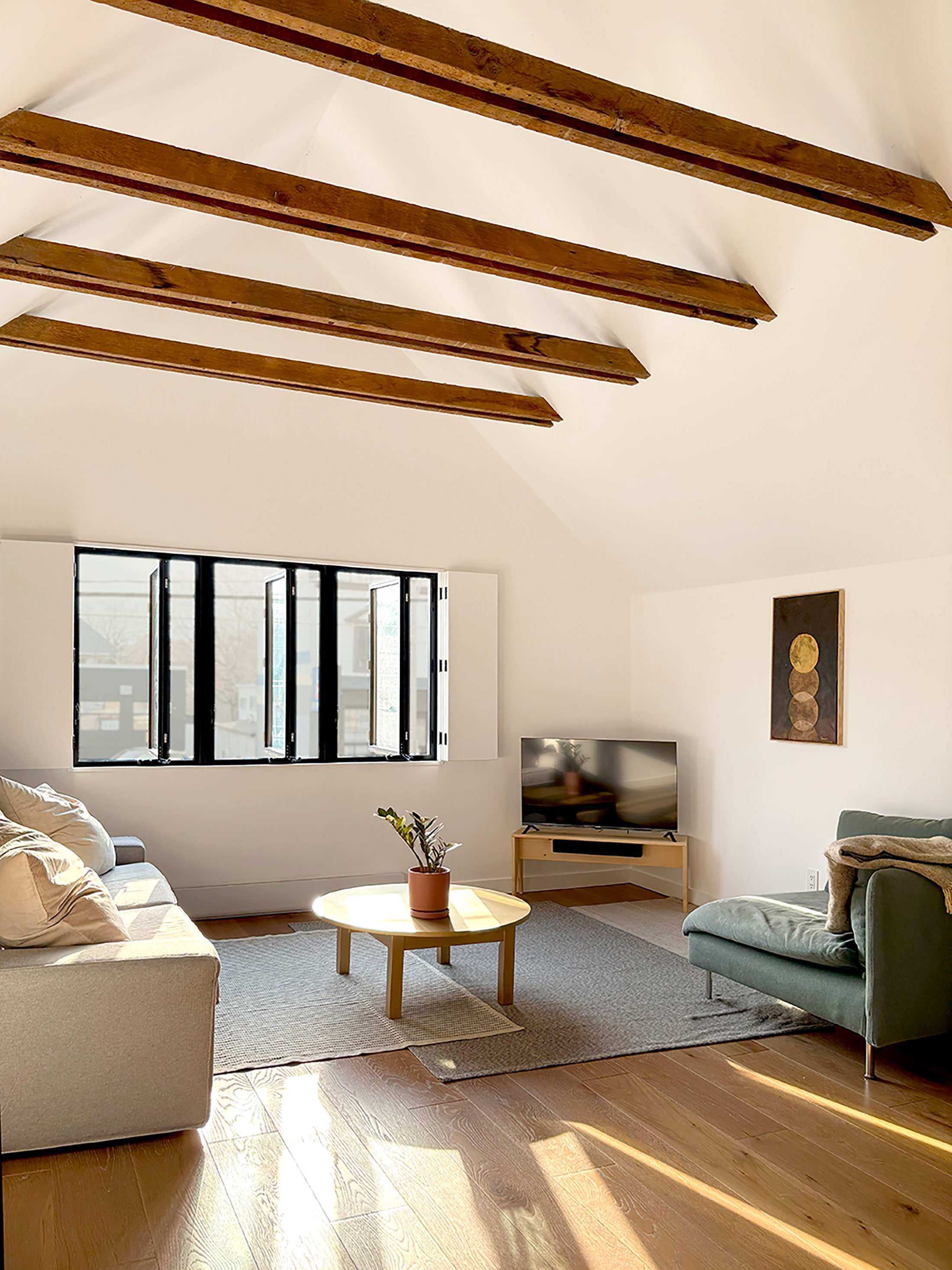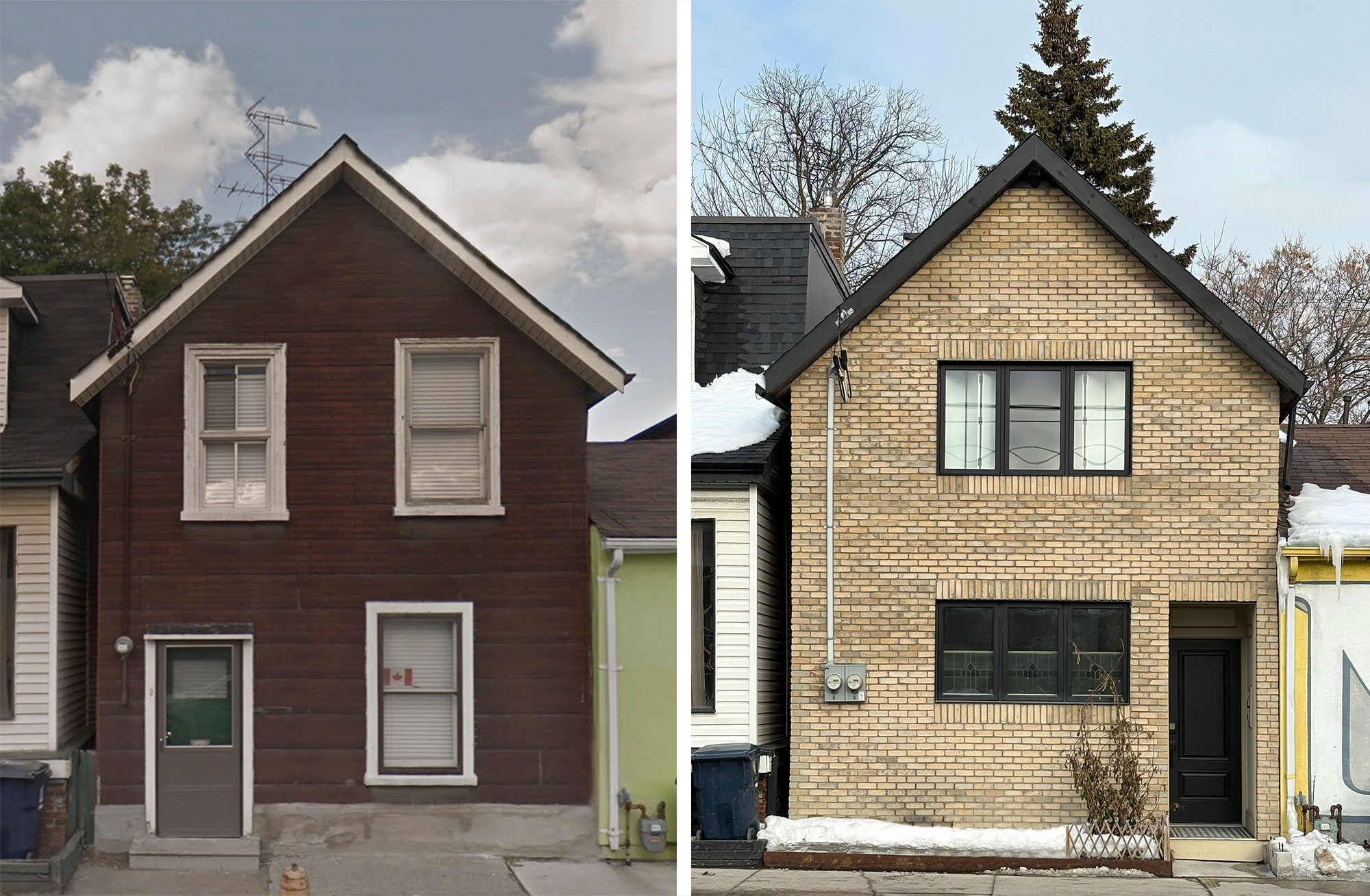 Built in the late 1800s, this house is one of the oldest in Toronto. The walls, ceilings and floors were stripped back to the studs for a fresh start. Small rooms and low ceilings were removed to make bright open spaces for modern living. To keep the old charm, the ceiling was vaulted and original collar-tie beams were exposed.